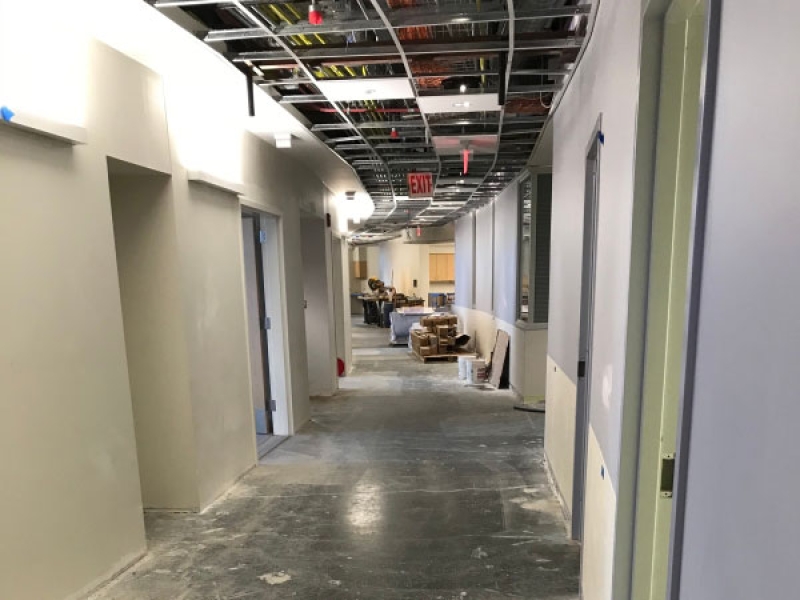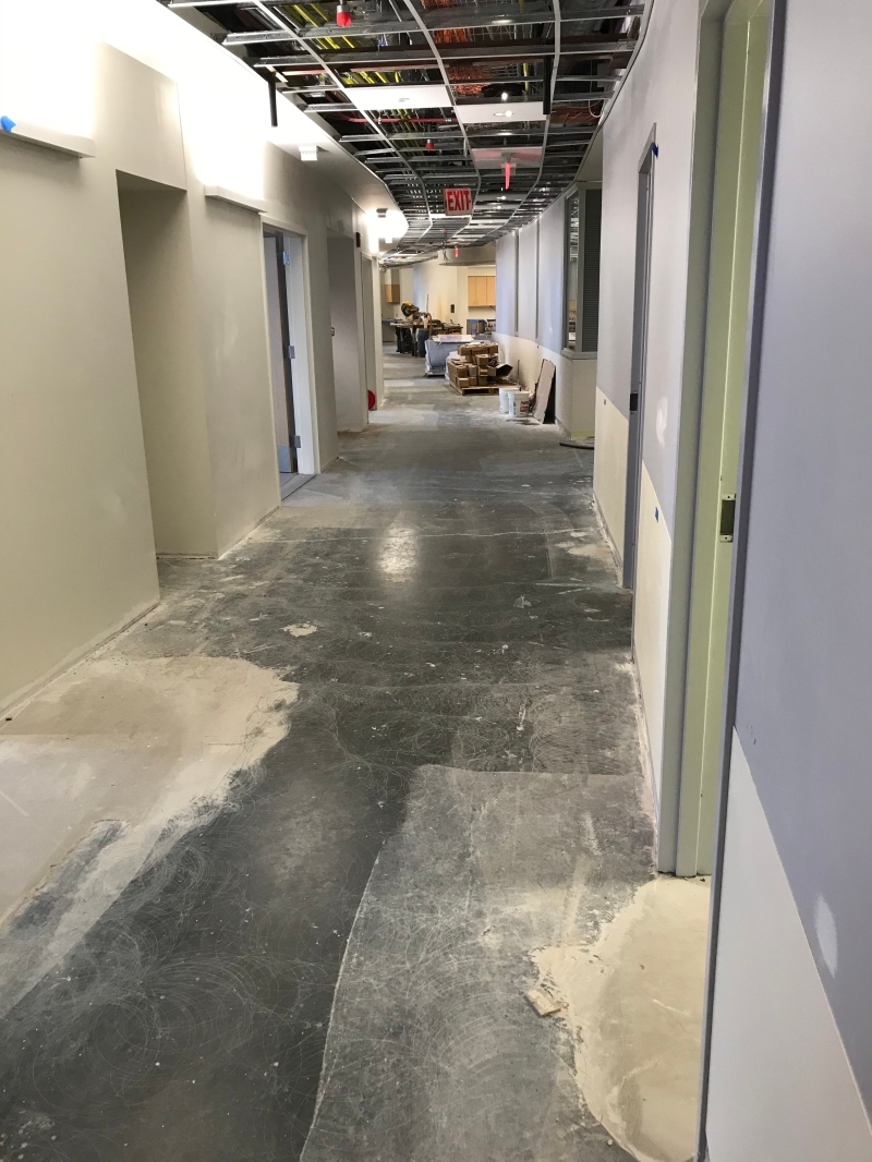 Spectra Flooring. This is a three floor addition to the top of the hospital. We are helping Spectra by installing underlayment to correct substrates before the installation of 2x2 foot Nora rubber flooring.